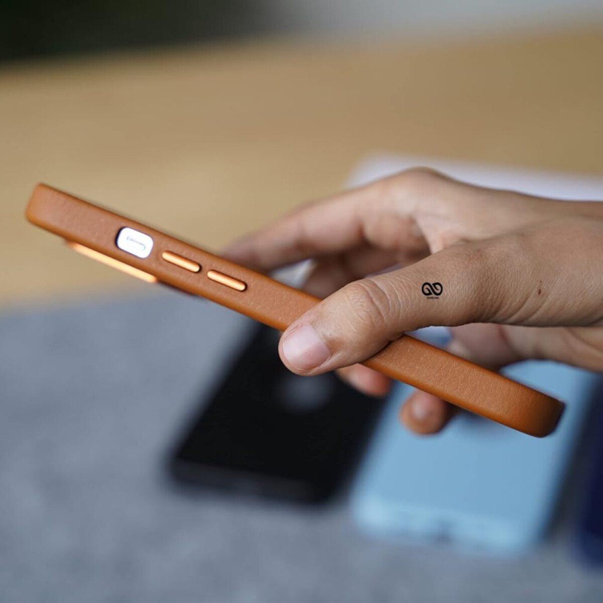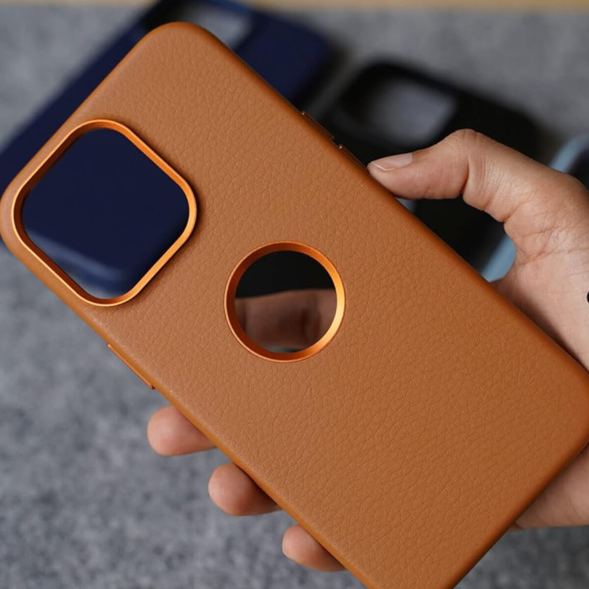 Grainy Textured Premium Vegan Leather Case with Logo Cut for iPhone. Made of High Quality Vegan Leather. Protect Your iPhone From Scratches. Raised lips for lens and screen protection. Support Wireless Charging. Aluminum Metal Camera ring Protects camera. Better Grip. Protect your phone in style with this sleek and durable mobile cover. Designed to provide a snug fit for your device, it offers full protection against scratches, bumps, and accidental drops. The cover is made from premium-quality material, ensuring durability and long-lasting use, while the smooth, matte finish adds a touch of elegance to your phones appearance.