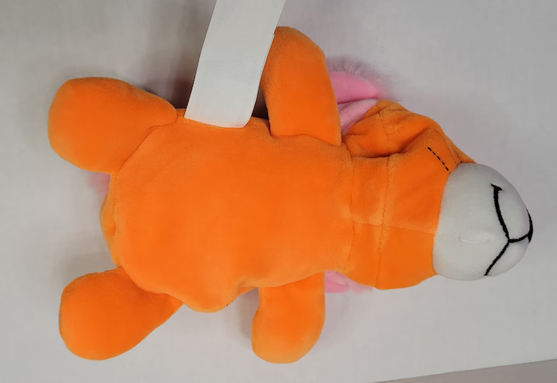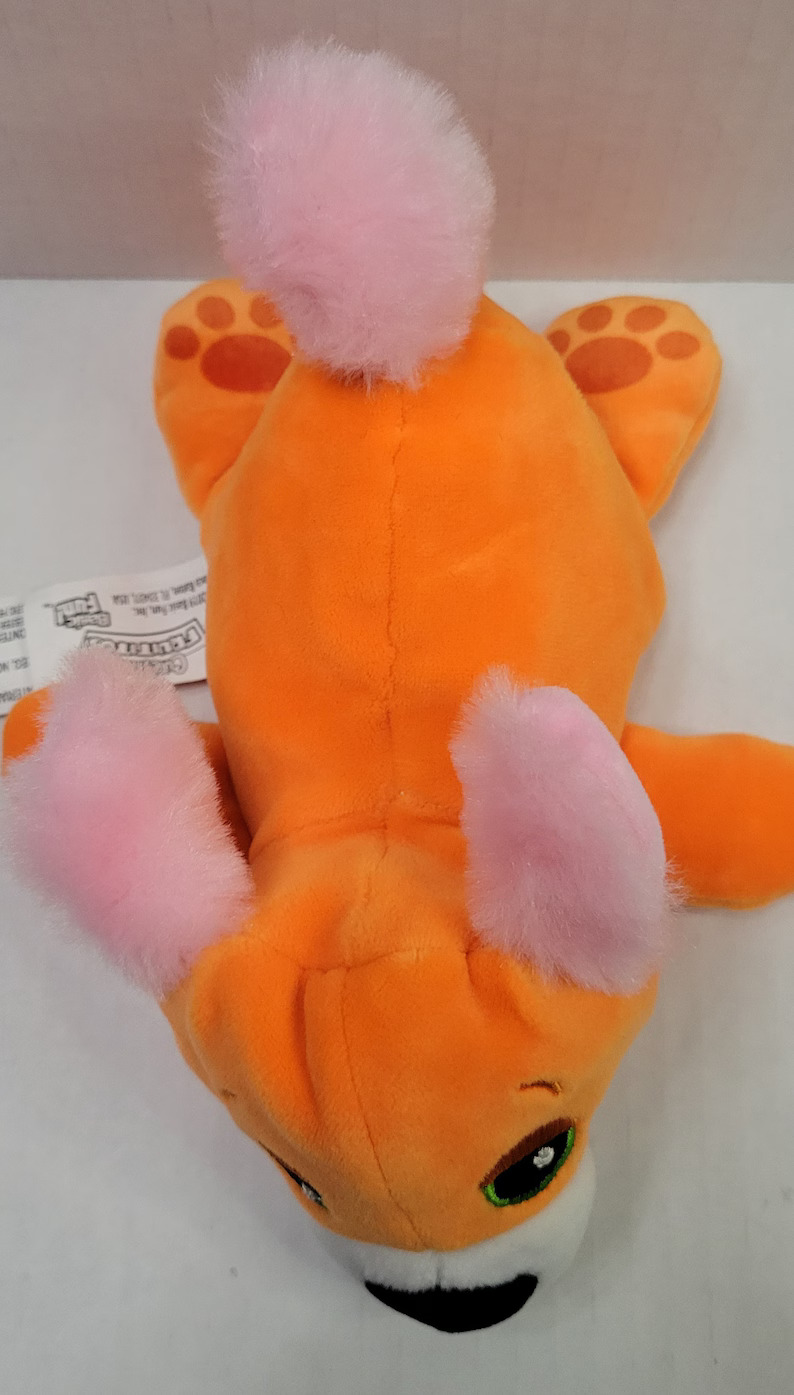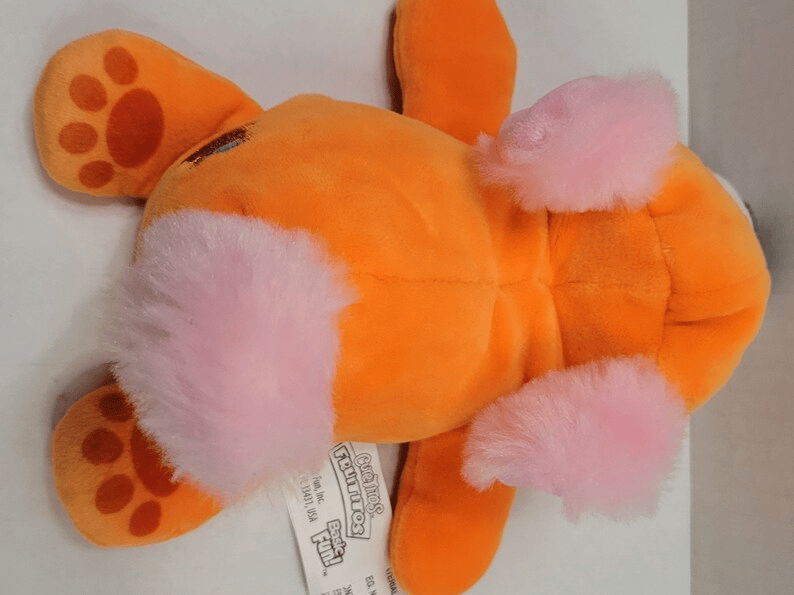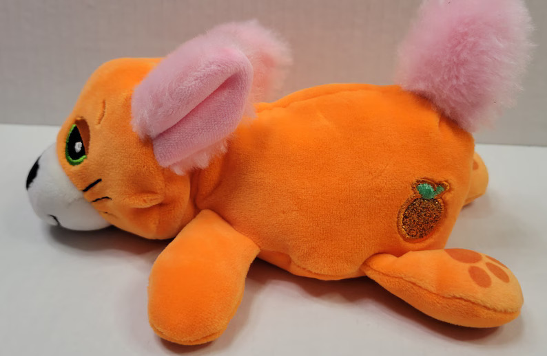 Cute orange animal mouse, or wallobe! There is a sparkle orange print on its backend. Pink ears and tail with embrordered green eyes. This is a cute bean plush.