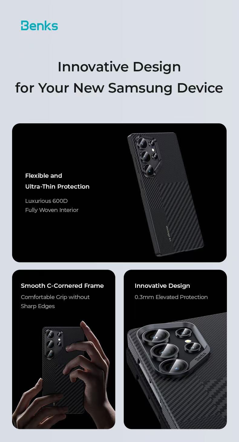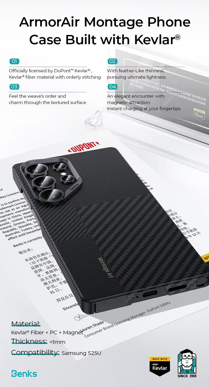 Made with 600D and 1500D DuPont™ Kevlar® fiber, the Benks Montage ArmorAir Case combines durable craftsmanship with a sleek, minimalist style for Samsung Galaxy S25 Ultra.