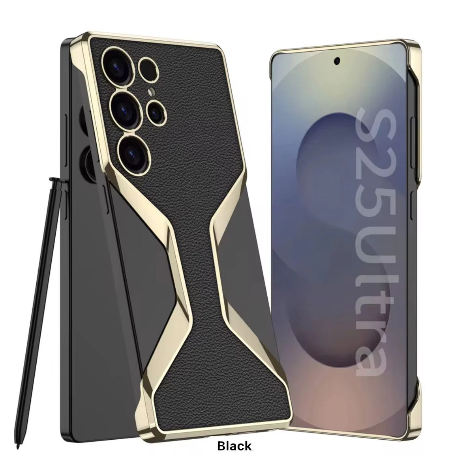 For Samsung Galaxy S25 Ultra Bracket Case Electroplating Leather Camera Protection Phone Cover – Black