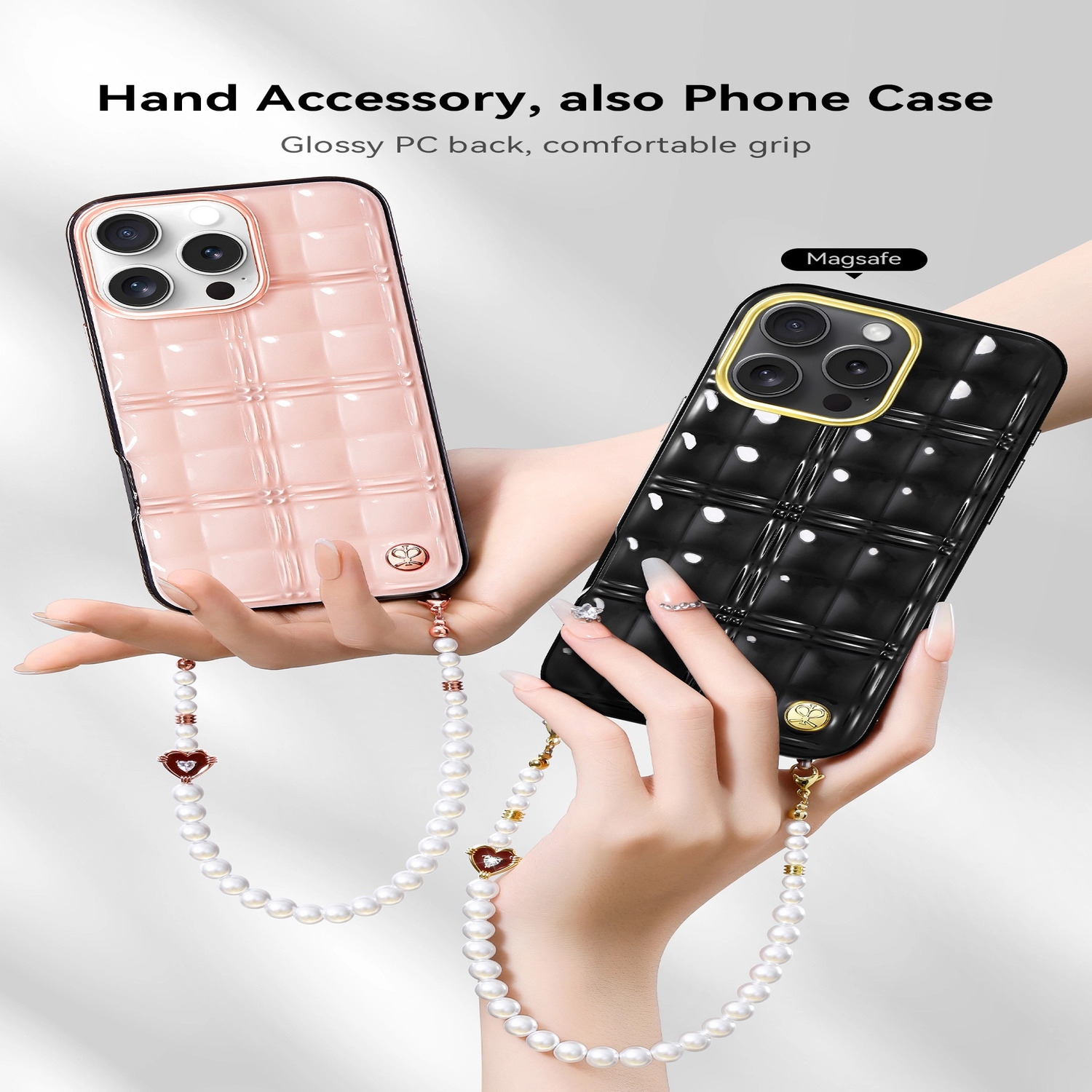 The Metal Grid Magnetic Phone Case+Glass Beads Phone Chain (Set) Series integrates hand woven design inspiration into hand accessories. Designers use warp and weft weaving to express the passage of time, juxtaposing joy between colors and textures. Golden ornaments shine brightly on glossy glass back, achieving extreme luxury in low-key fashion.