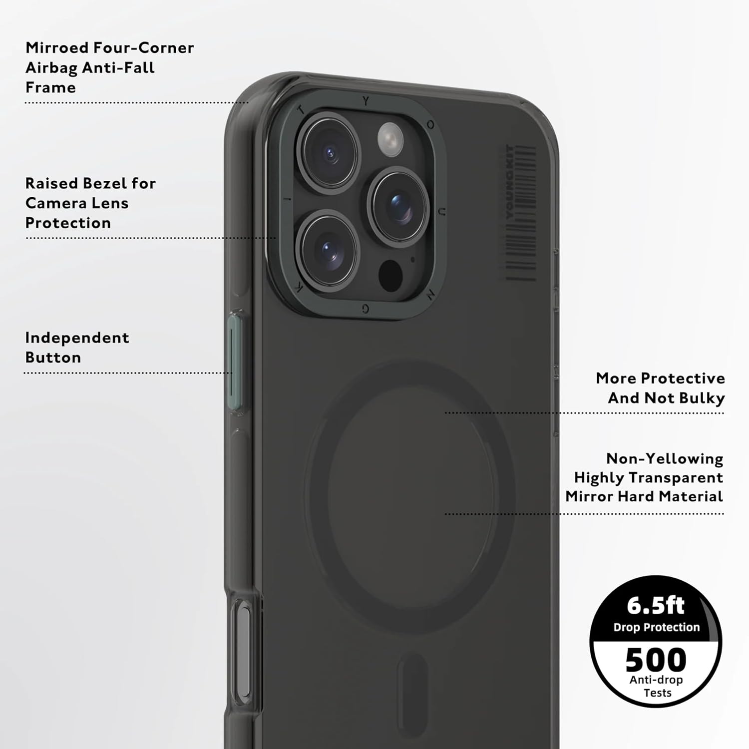 YOUNGKIT environmentally friendly case uses 70% recyclable bio-based plastics and recycled plastics, with 30% “target” plastics, that is the plastic with level 5 yellowing resistance of Bayer, effectively delaying the oxidation of the frame. This combination not only improves the material’s durability and performance, it also makes the product more biodegradable, reduces environmental pollution and significantly reduces the use of virgin plastic. The production of each eco-friendly phone case reflects our commitment to the future of our planet.